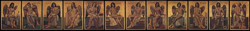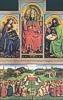 Abbildungen der verschiedenen Tafeln: Sebastian der Märtyrer, Kreuzigung, Antonius der Einsiedler, Verkündigung, Weihnachtsszene mit Engelskonzert, Auferstehung, Antonius bei Paulus, Augustinus, Antonius, Hieronymus, Versuchung des Antonius